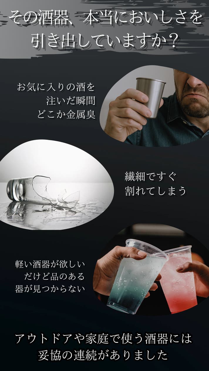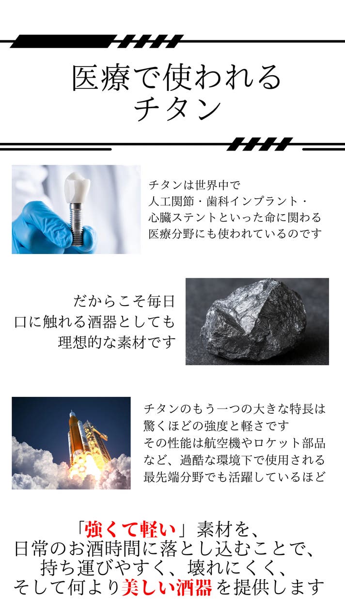 強くて軽いチタンを日常のお酒時間に落とし込むことで、持ち運びやすく、壊れにくく、そして何より美しい酒器を作り出すことに成功いたしました。