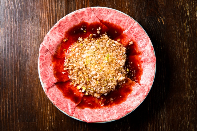 - 極上の和牛をひれのタルタル、ザブトンのおろポン焼きなど、部位に合わせた最適な味付けで提供