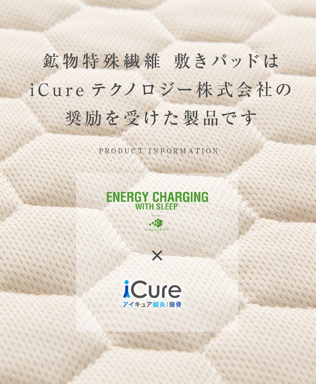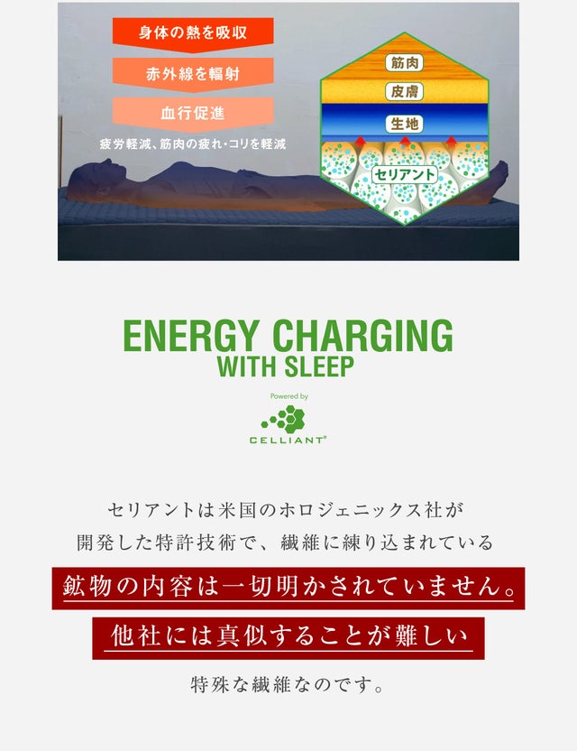 セリアント敷きパッドは鉱物を練り込んだ特殊繊維で疲労の軽減と筋肉の凝りを軽減します。
