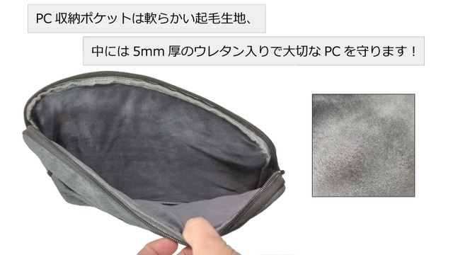 ▼PC収納ポケットはクッション性ある起毛生地で13.3インチ(一部の13.5インチ)まで収納出来ます!