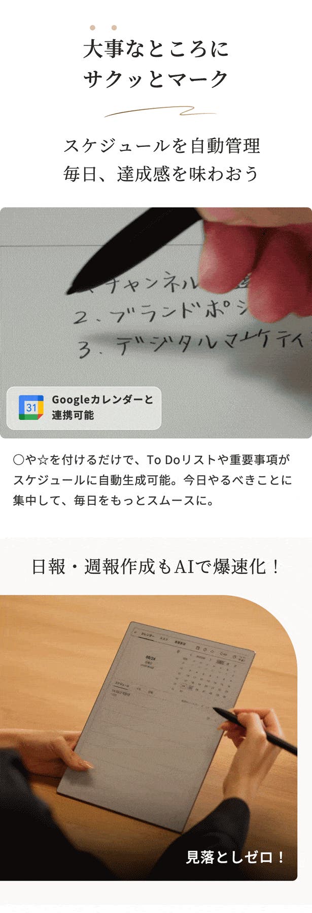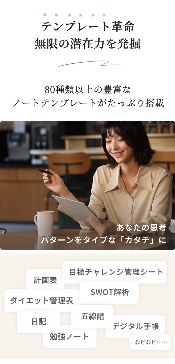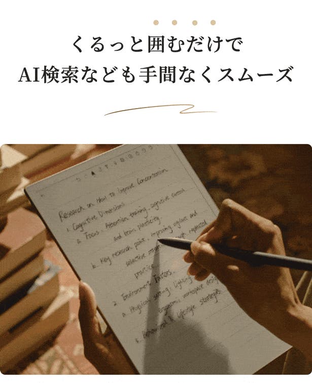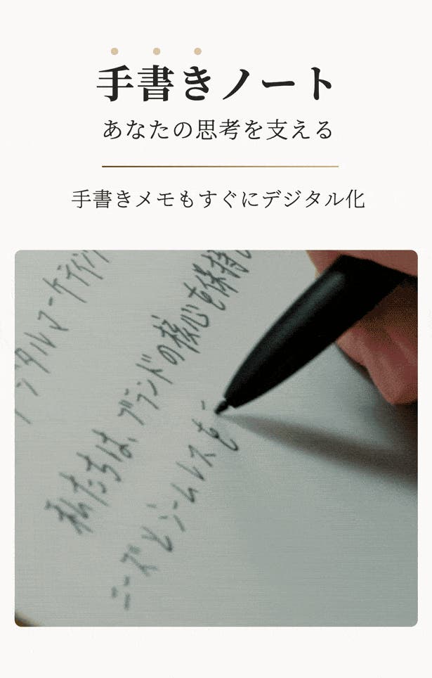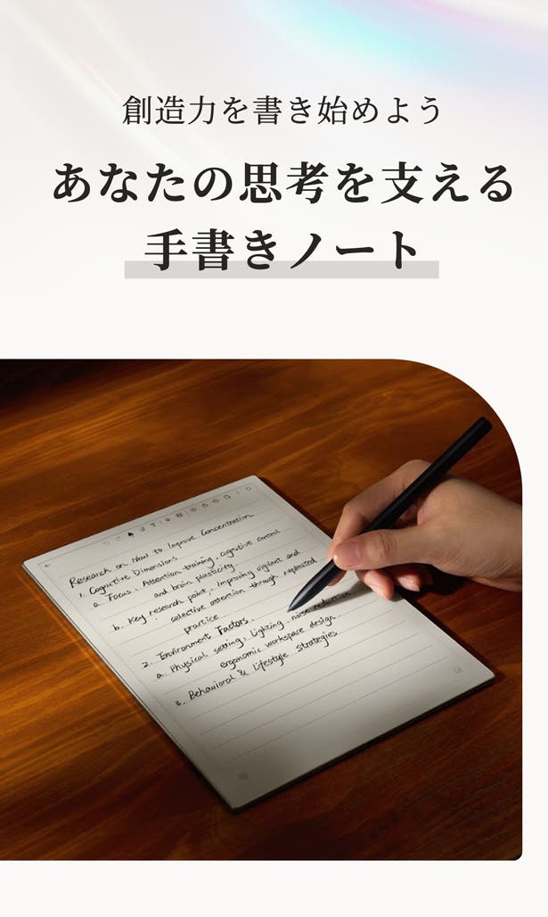 手書きの自由さとデジタルの利便性を兼ね備えたAINOTE 2。学習や会議中の重要なポイントや気づきを、いつでも手軽に記録できます。考えがまとまらないときは、いったん書き出してみよう。心が動いた瞬間を記録して、あとで振り返ってブラッシュアップ!