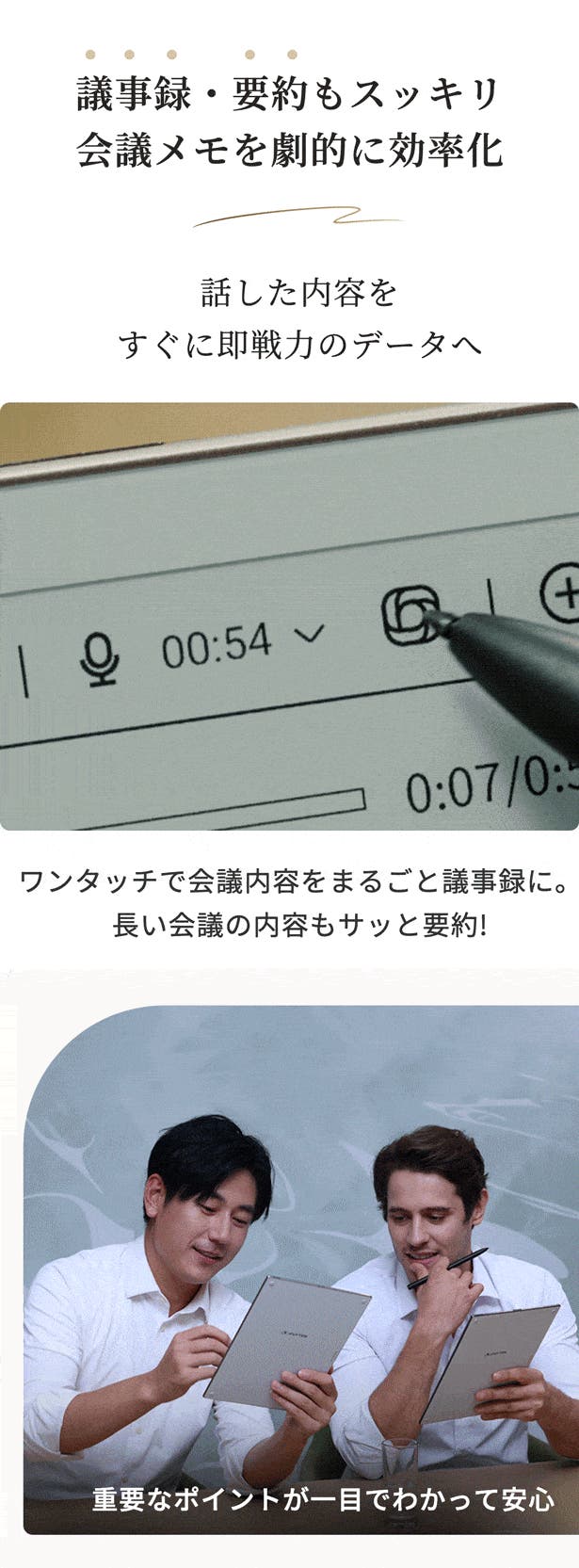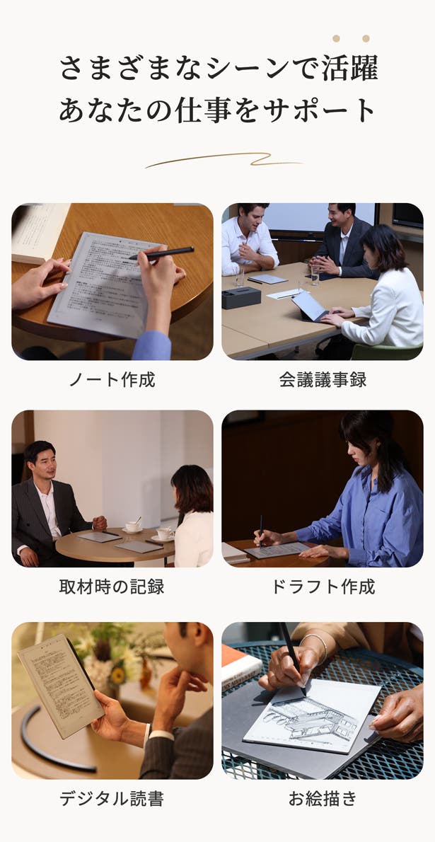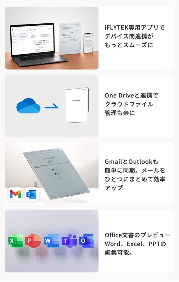 手書きメモ・録音・文字起こしが完全同期、ワンクリックで瞬時にアクセス!Bluetooth® 5.4搭載し、イヤホンを装着するだけで周囲のノイズを遮断。仕事に没頭でき、大事な場面を逃さずに記録。内容の振り返りもアイデア整理も簡単。