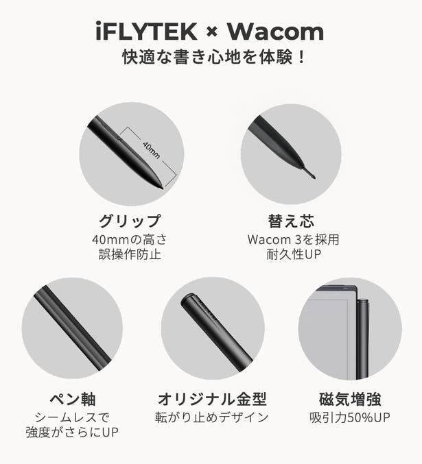 iFLYTEKとWacomが共同開発!細部までこだわった専用スタイラスペンで、かつてないほど快適な書き心地を実現。持った瞬間にワクワク!書くことの楽しさを呼び覚ますスタイラスペンで、新たな筆記体験を!