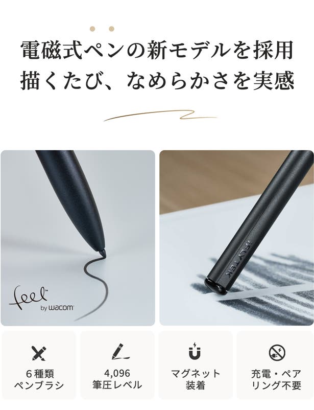 全長162mm、たった19gの軽量ボディ。自然な持ち心地で、長時間の創作も快適に!手書き入力の遅延をさらに低減し、ソフトなペン先でなめらか、紙に書いているような描き心地を実現。