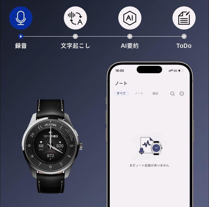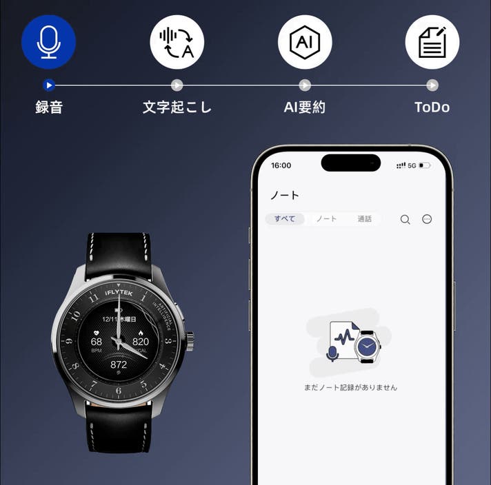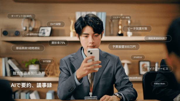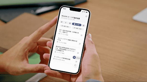 AIが会話から「やるべきこと」を自動抽出し、ToDoリストを自動作成!作成されたToDoはスマホカレンダーに同期され、「予定」は設定時刻に腕時計型端末にリマインドされます。議論の内容を、確実に実行へ。
