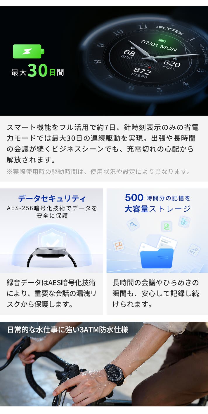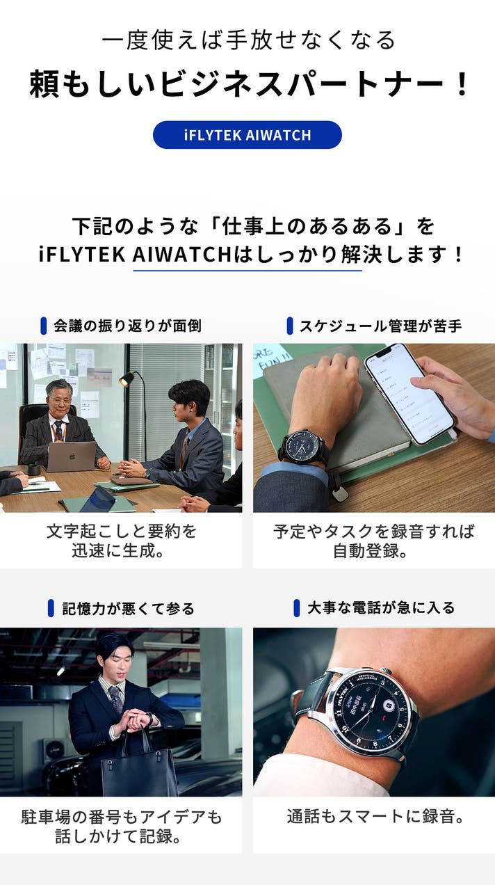 iFLYTEK AIWATCHは、まさにそんなビジネスパーソンの願いを叶えるために生まれました。「サッと打ち合わせを録音したい」「会議の要約を作りたいが、面倒だ」「アイデアを考える時間が欲しい」。そんなビジネスパーソンの願いを叶え、悩みを解消します!