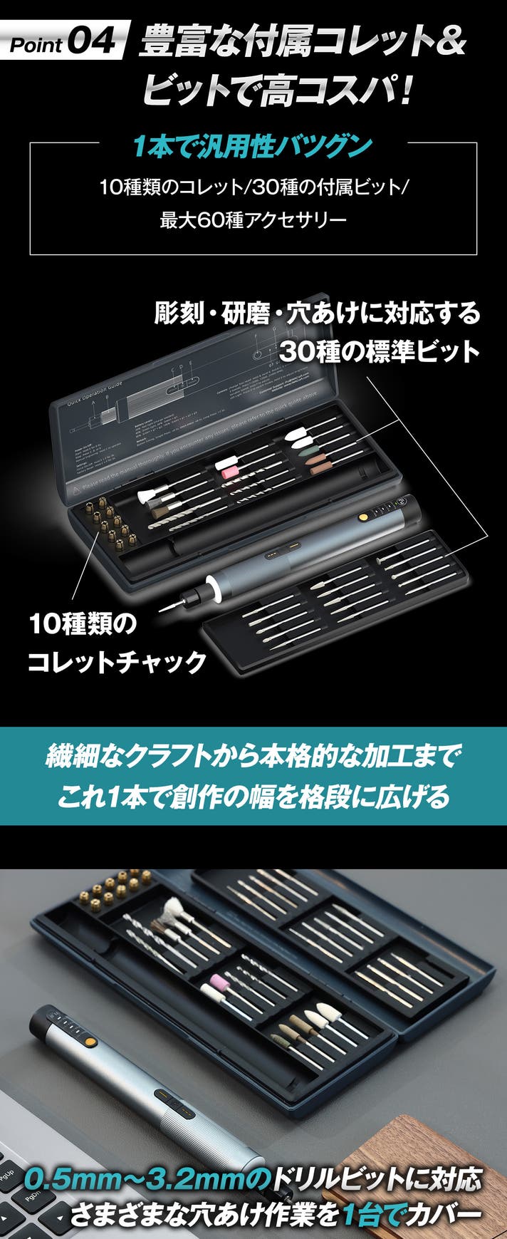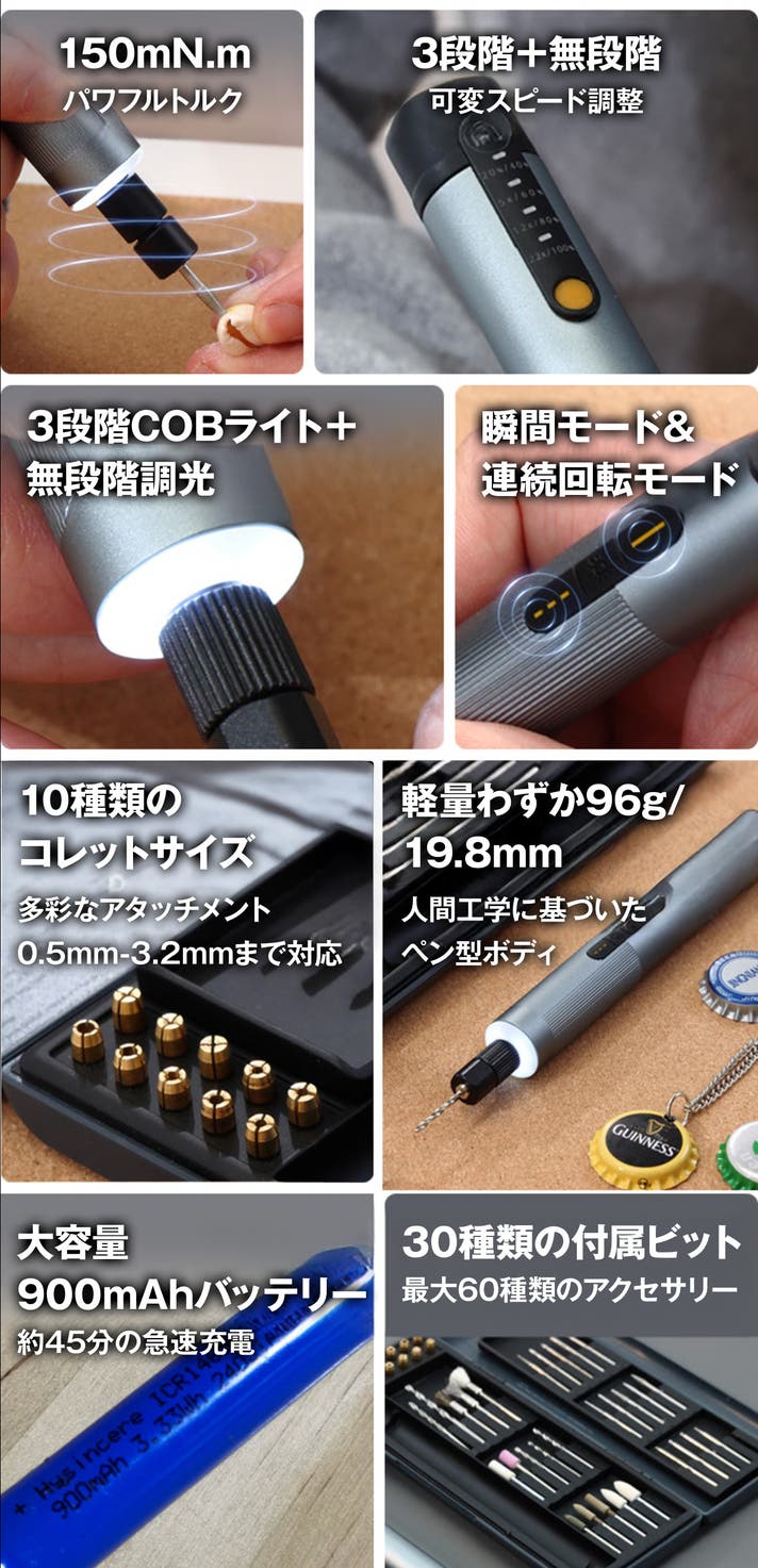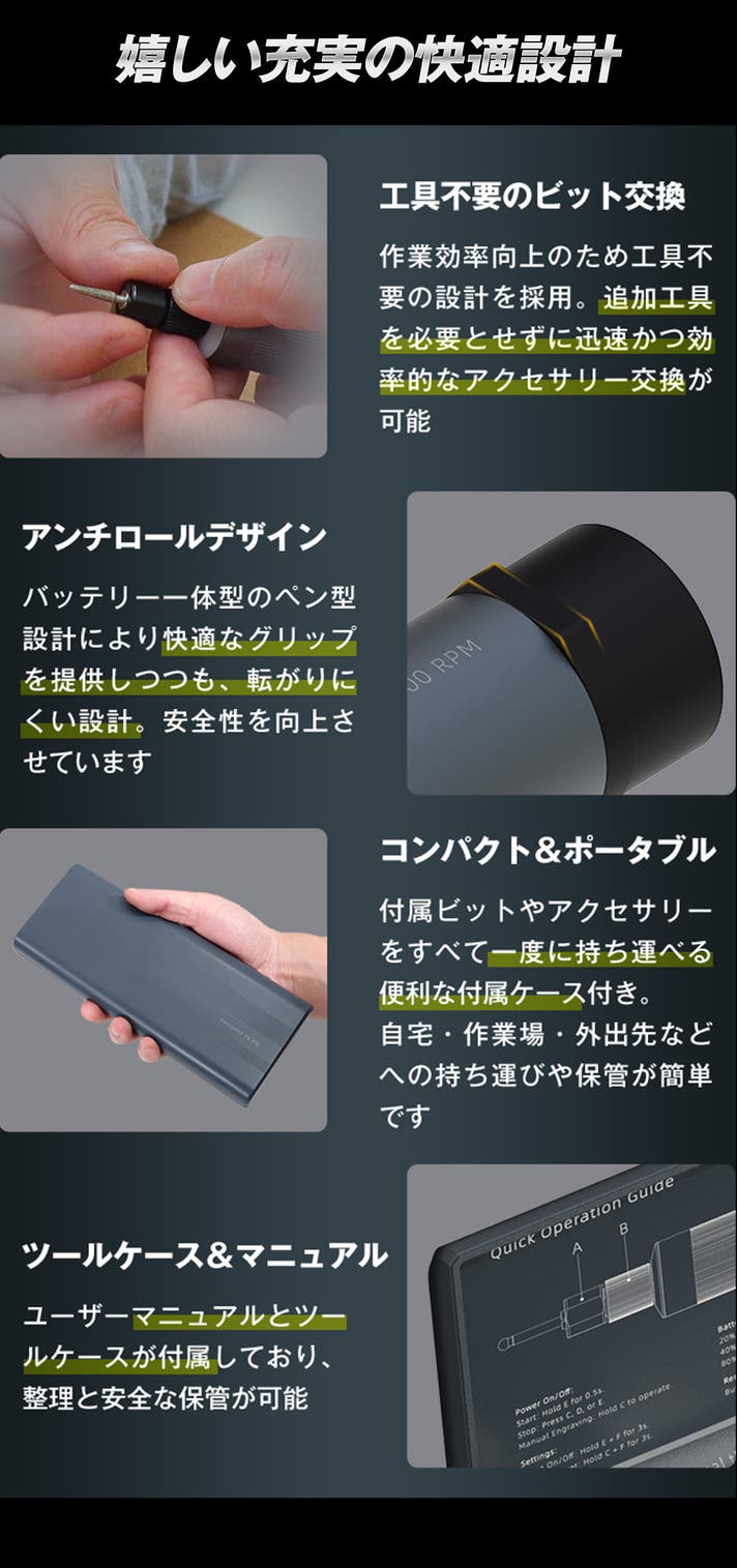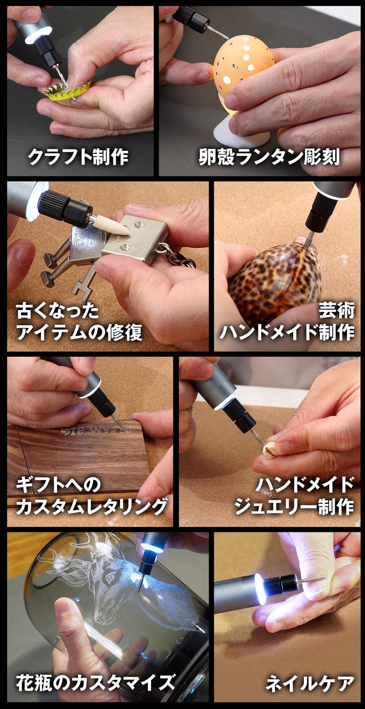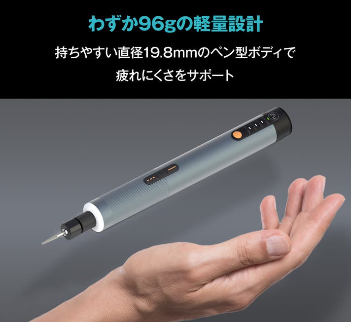 - 高精度彫刻と穴あけの両方に対応、96gの手のひらサイズの電動ペン!操作簡単で初心者にも!