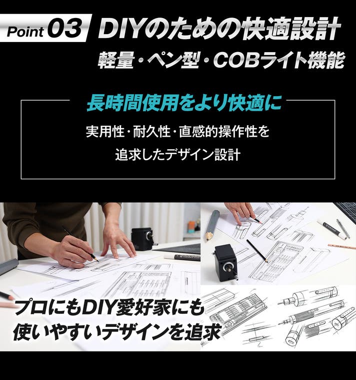 作業に応じた微調整が可能で、DIY作業のストレスを大幅に軽減します