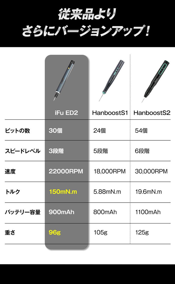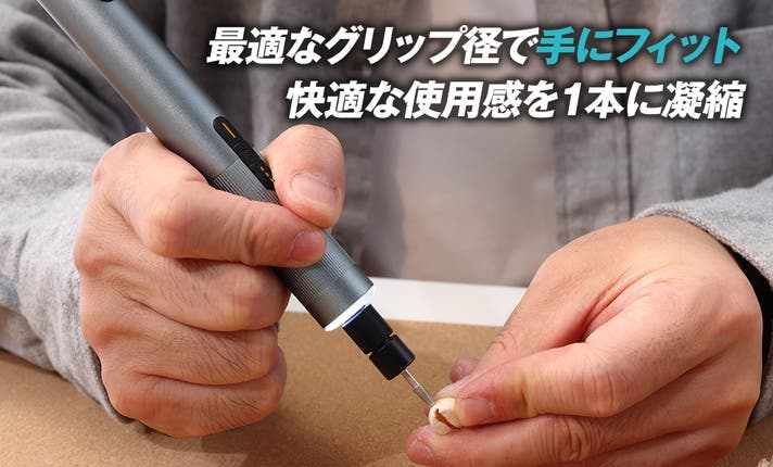A:本商品は、従来品と比べて、彫刻ができること・トルク数が優れており、日常の様々なシーンで快適にお使いいただけます。細部までこだわった設計が特長です。