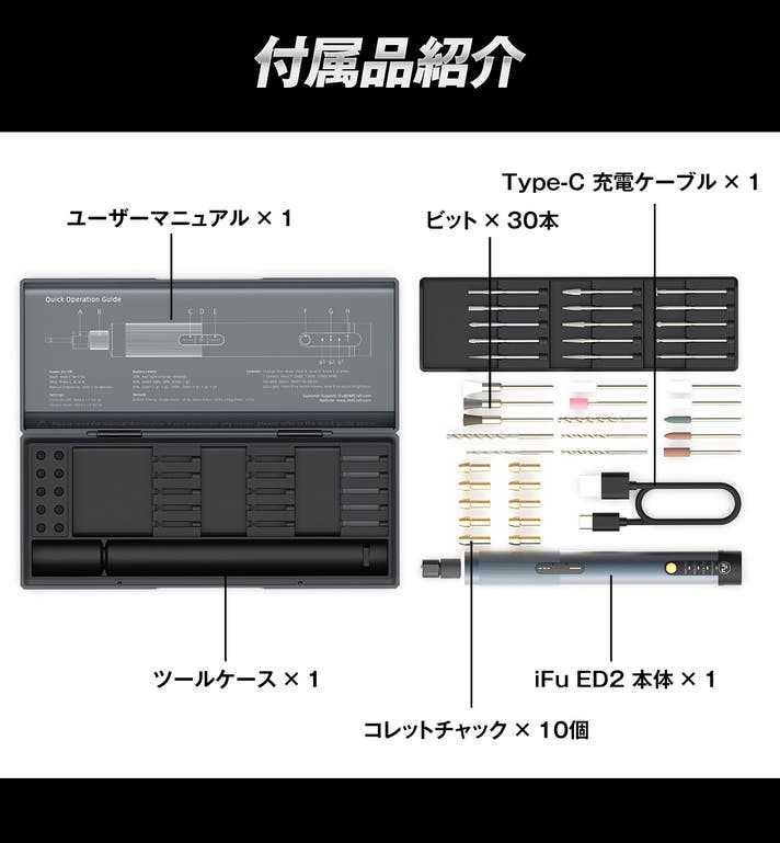 DIYやハンドメイドで、工具の重さやパワー不足、スピード調整の難しさに悩んでいませんか?「iFu ED2」は、そんな悩みを解決する高性能ツールです。軽量設計で長時間作業も疲れにくく、精密な作業もスムーズ。スピード調整やパワーコントロール、LEDライトで細部まで見やすく、工具不要のビット交換で作業効率もアップ。バッテリー持ちや発熱・振動対策も万全で、アクセサリー整理も簡単です。コンパクトながら多機能で高性能。その思いから本プロジェクトを起案しました。