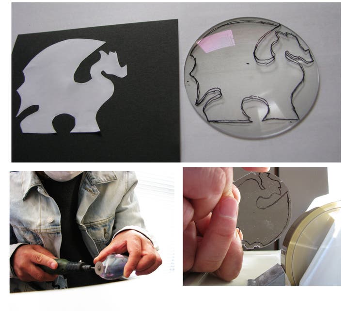 レンズに絵を写し取り、削っていきます。3Dプリンターでは度数を付けられないためルーペは作れません。
