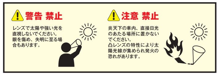 補足:夏場の車中は高温になるため、温度変化によりレンズにひび割れを起こします。車内には置かないでください。