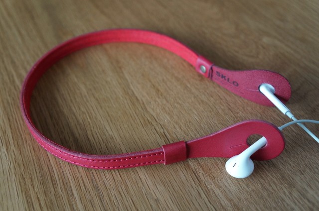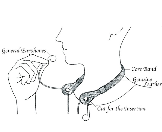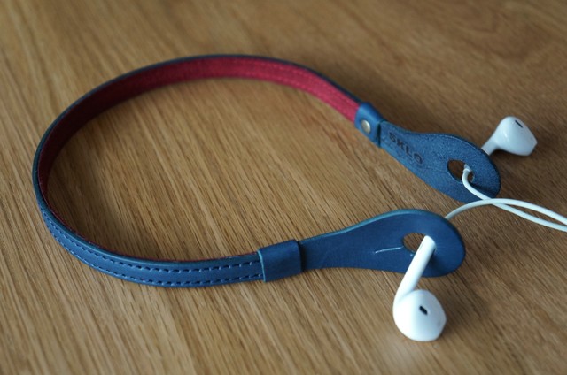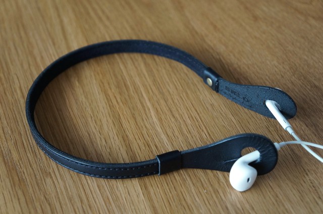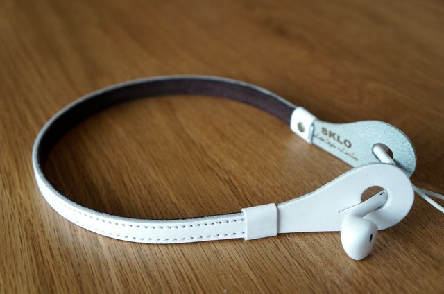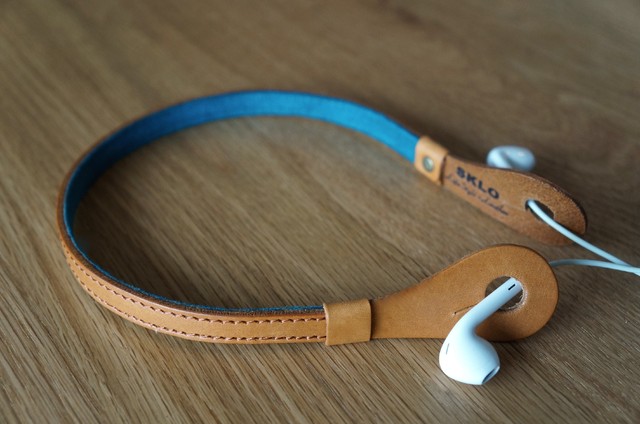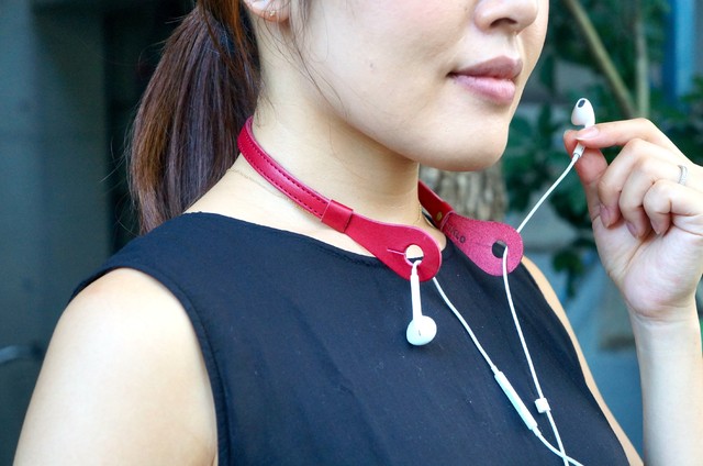 "iHooc"(アイフック)イヤホンの首もとでのホールドを可能にするレザーアイテムです。