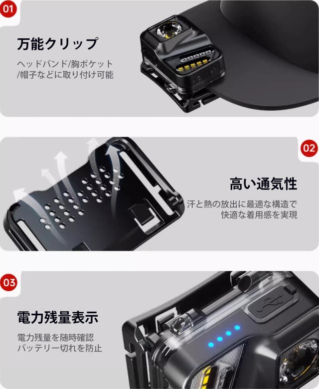 - 20時間使用可能な大容量バッテリー。45°の角度調整可能で頭を動かさずに好きな場所を照らす!