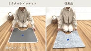 ミラクルトイレマットと従来品の裏面それぞれに、小さなラメ粉末をのせてみたところ、ご覧の通りサッと掃えちゃいました。細かなゴミも付きにくい仕様です。裏面のお手入れも、乾拭き水拭き、除菌スプレーOK!