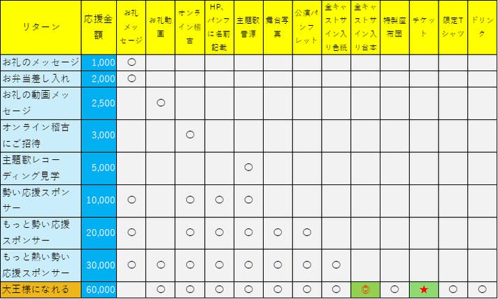 - 目標金額達成毎に目標リターンやグッズ商品が増える(主題歌プレゼントやドラマCD、DVD発売等)