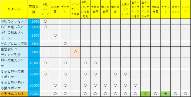 - 目標金額達成毎に目標リターンやグッズ商品が増える(主題歌プレゼントやサントラ盤、DVD発売等)