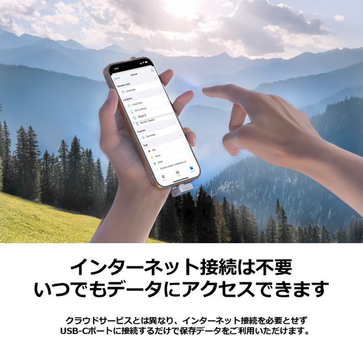 クラウドサービスとは異なり、インターネット接続を必要とせず、USB-Cポートに接続するだけで保存データをご利用いただけます。