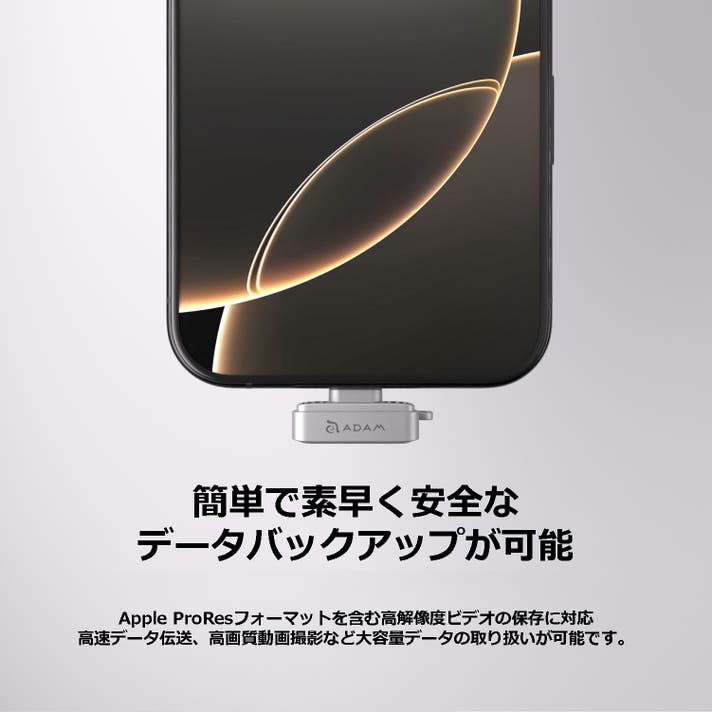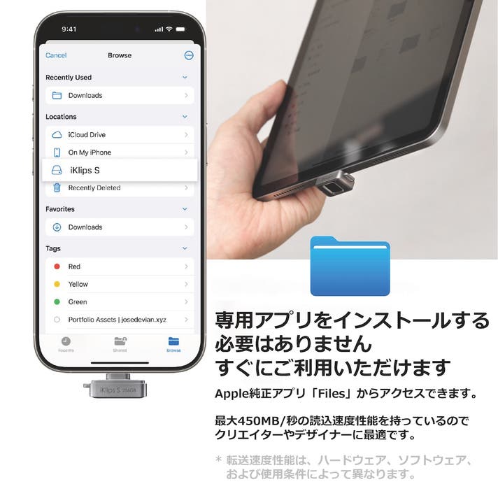 インターネット接続や専用アプリは必要なく、Apple社純正のアプリからアクセスでき、読込450MB/秒 (理論値)の高速転送性能に対応し、Apple ProResにも対応します。