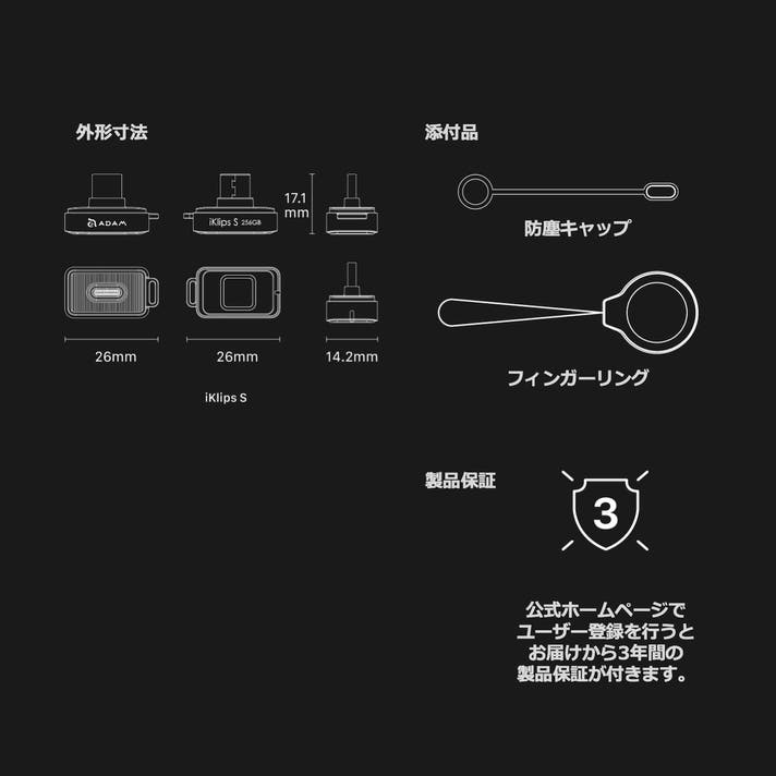 内容物:iKlips S本体(256GB)、防塵キャップ、紛失防止リング、日本語説明書