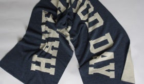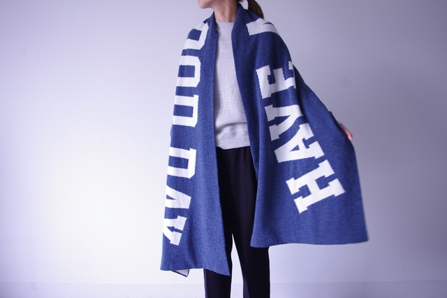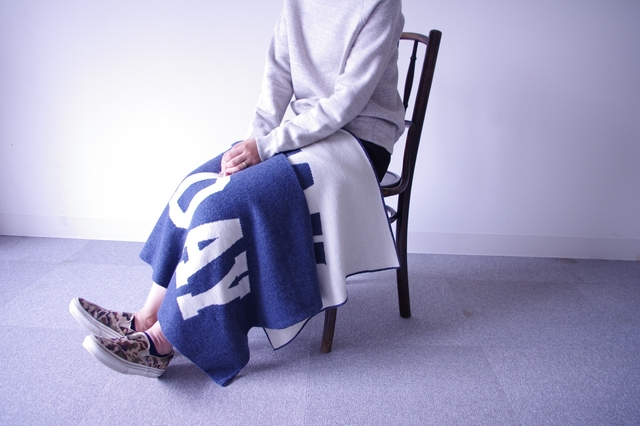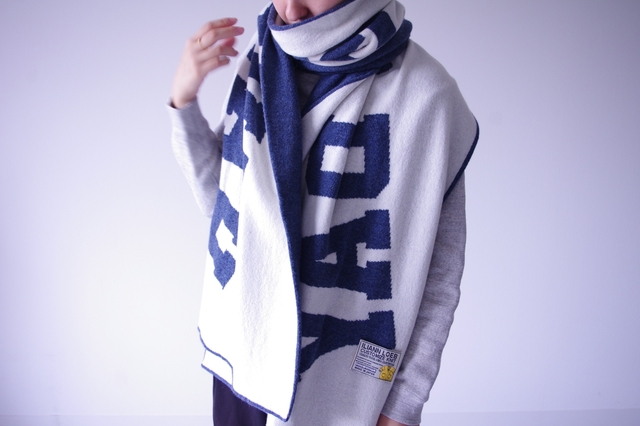 ・イリアンローヴカスタマイズニットのMakuake限定デザインのストールです。こちらのカラーは通常30色用意しているカラーでは展開していないインディゴカラーのベースに白のロゴが入ります。ロゴデザインもMakuake限定デザインとなっています。