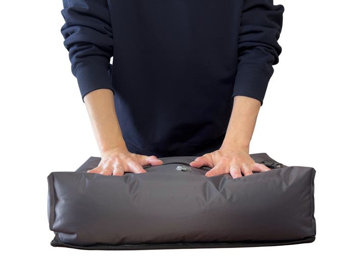 A. しっかりファスナーを閉めていただければ、通常の旅行期間中であれば大きく膨らむことはありません。長期保管の際は、定期的に状態を確認してください。