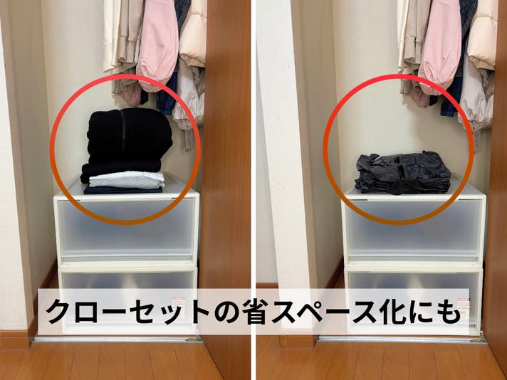 約十数秒で、かさばる衣類がぺたんこに。