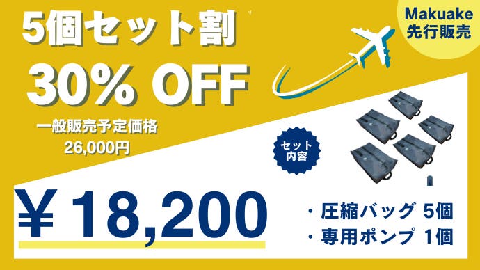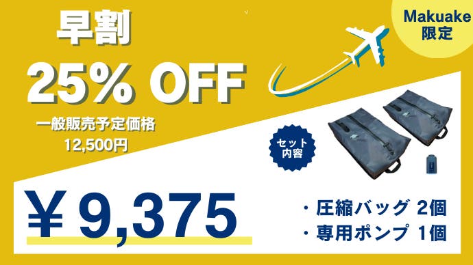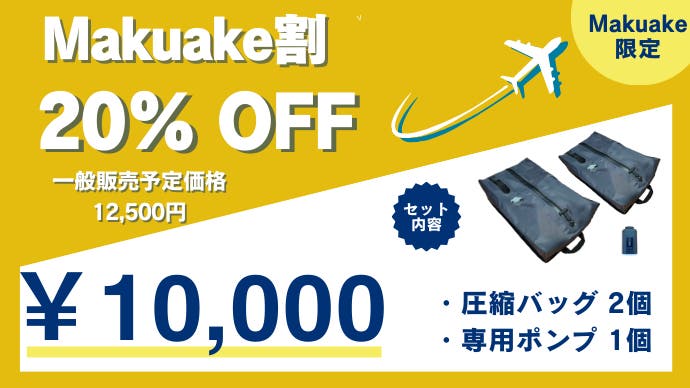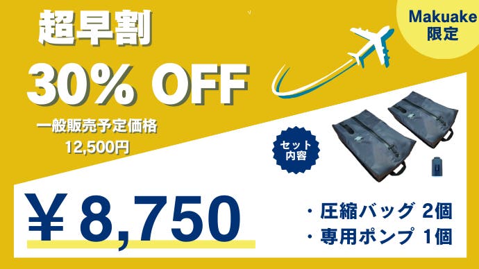 「Makuake(マクアケ)」は、実行者の想いを応援購入によって実現するアタラシイものやサービスのプラットフォームです。このページは、 プロダクトカテゴリの 「進化した圧縮袋/ 電動で荷物を小さく。スペースを創り出すトラベル圧縮バッグ」プロジェクト詳細ページです。