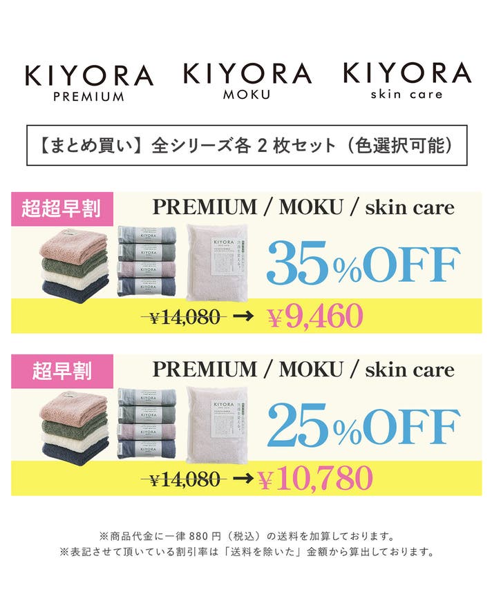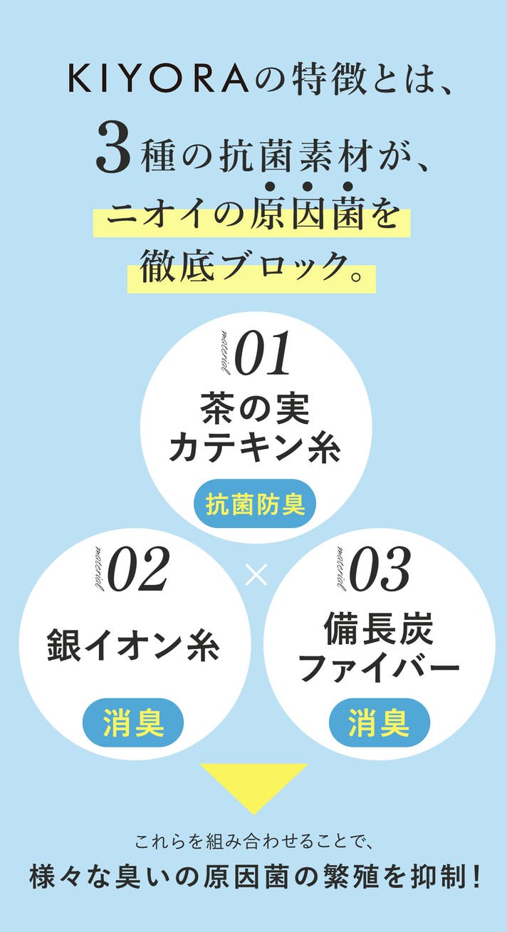 ■KIYORA Premium:綿75%、茶の実レーヨン22%、銀イオンポリエステル3%