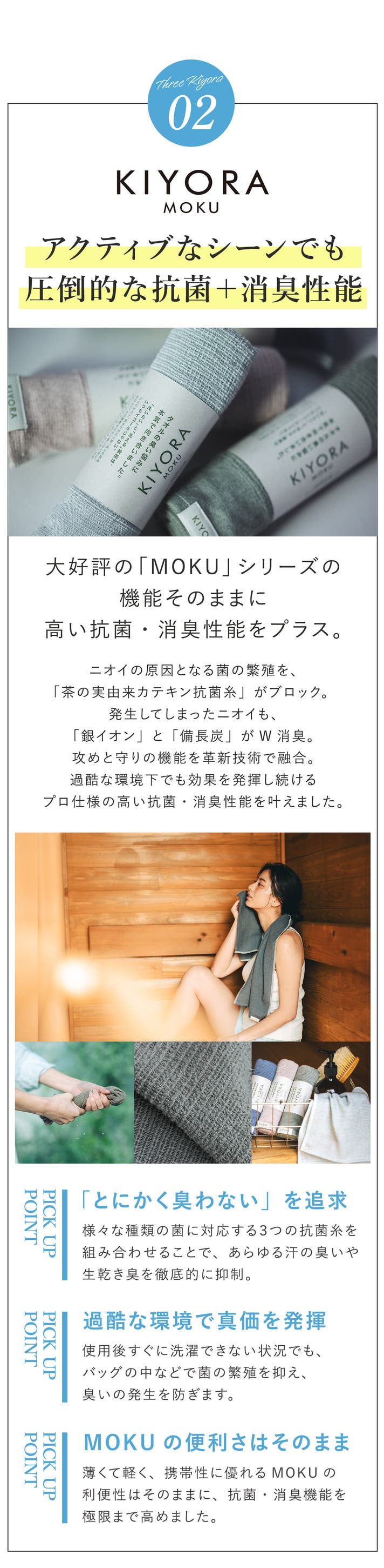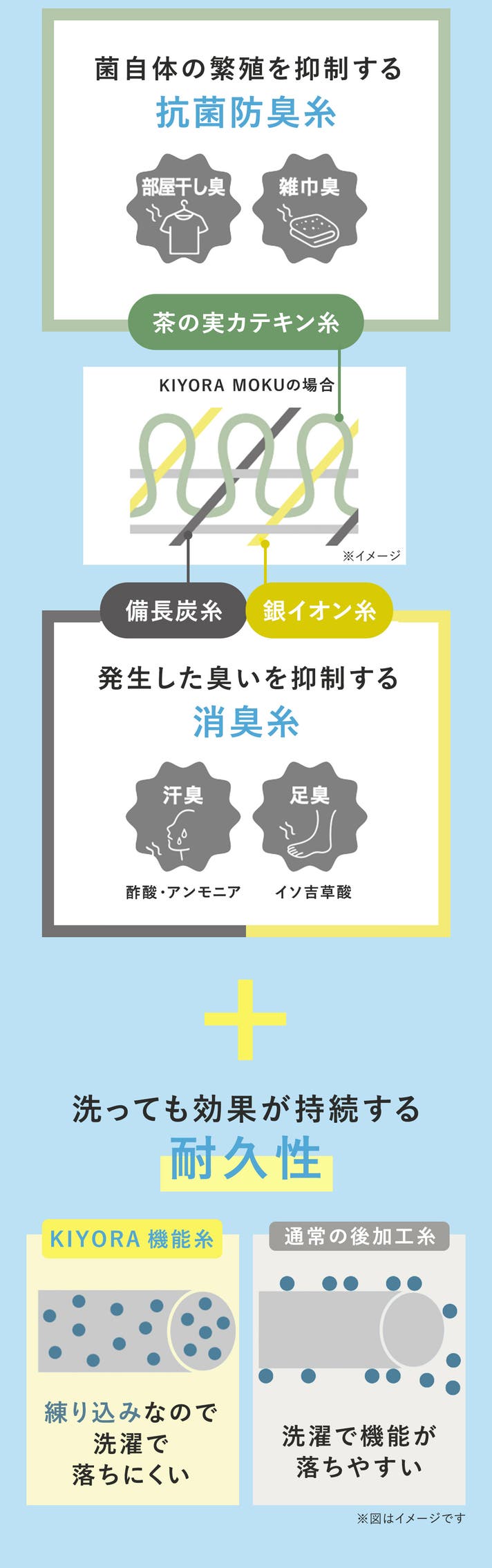 ■KIYORA MOKU :綿80%、茶の実カテキン12%、備長炭5%、銀イオンポリエステル3%