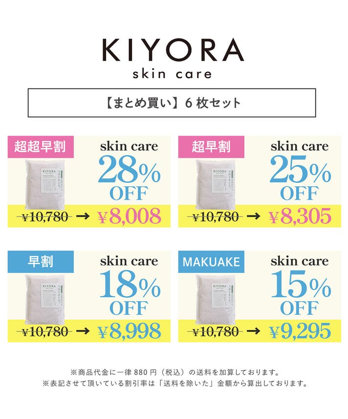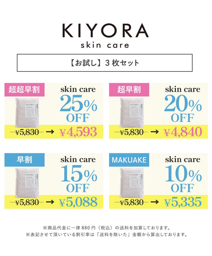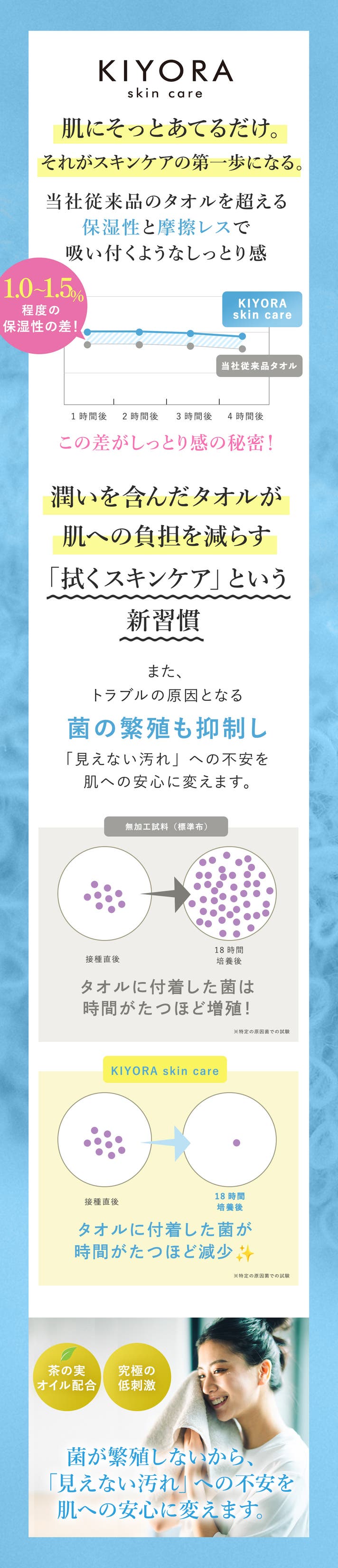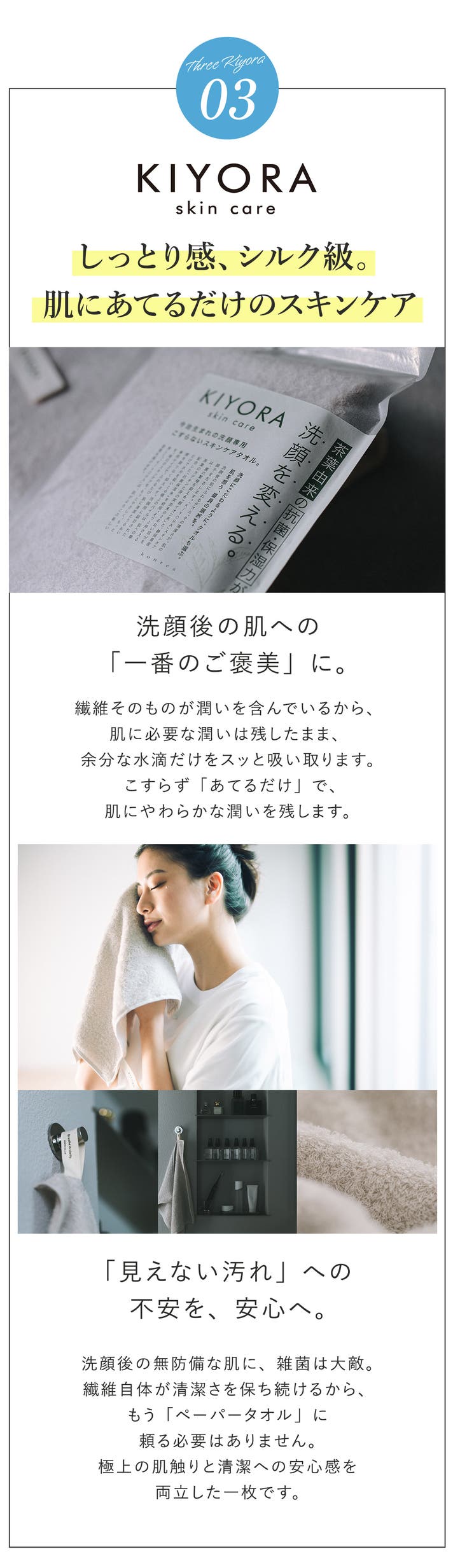 ■KIYORA skin care:綿73%、茶の実レーヨン24%、銀イオンポリエステル3%