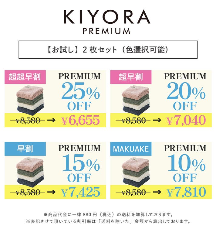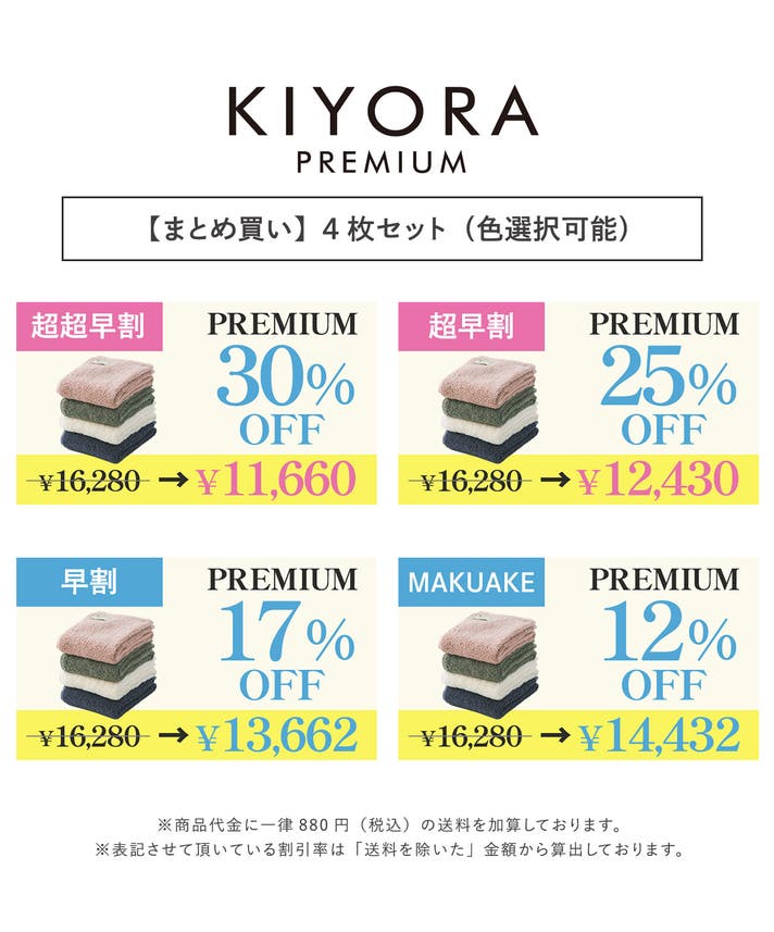■「PREMIUMタオル」のカラーは以下の4色からお選びいただけます。