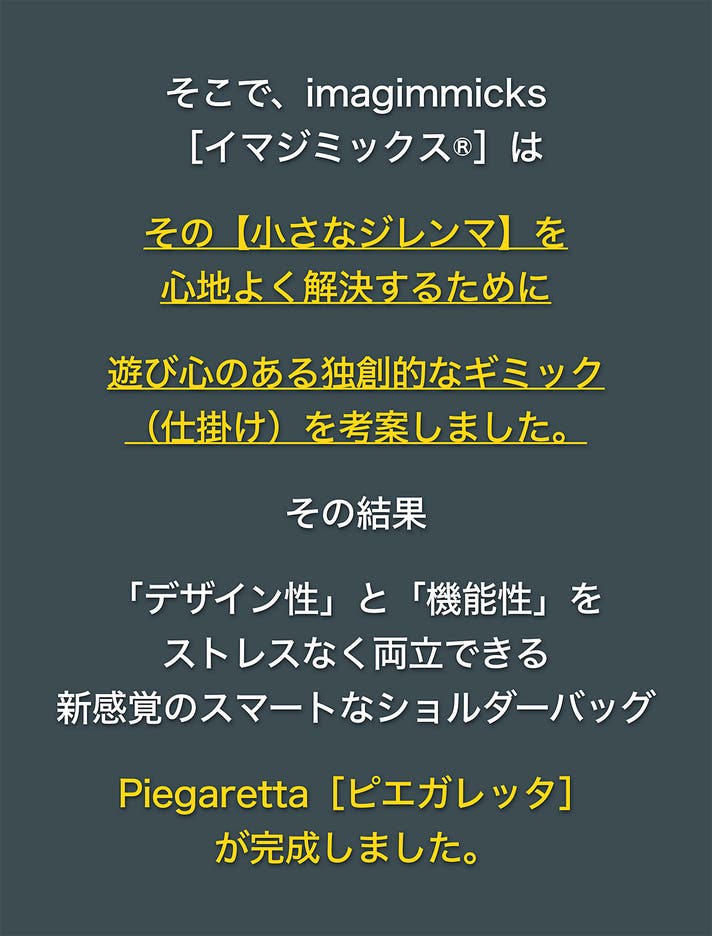 皆さま、はじめまして。imagimmicks[イマジミックス®]と申します。今回、Piegaretta[ピエガレッタ]というバッグのプロジェクトを公開させていただきます。よろしくお願いいたします。