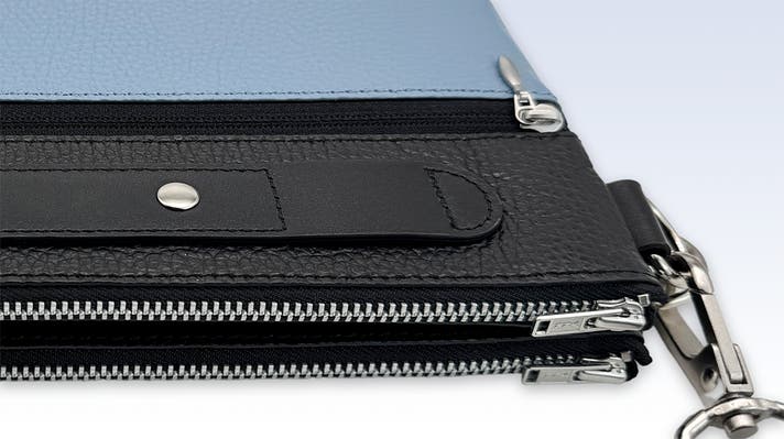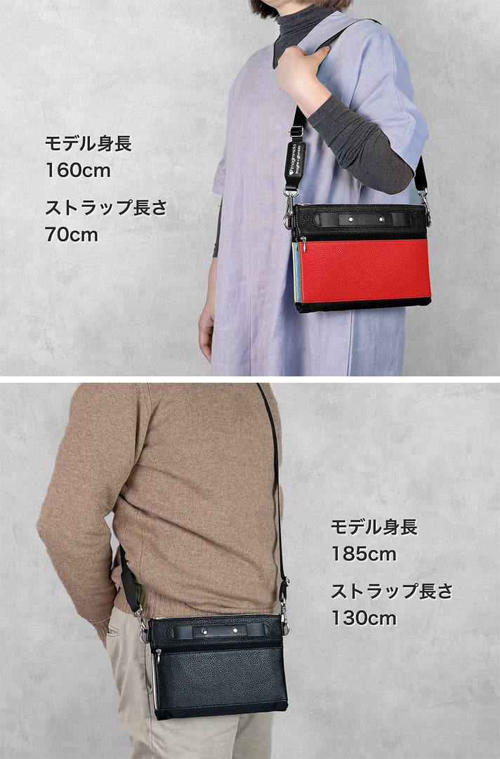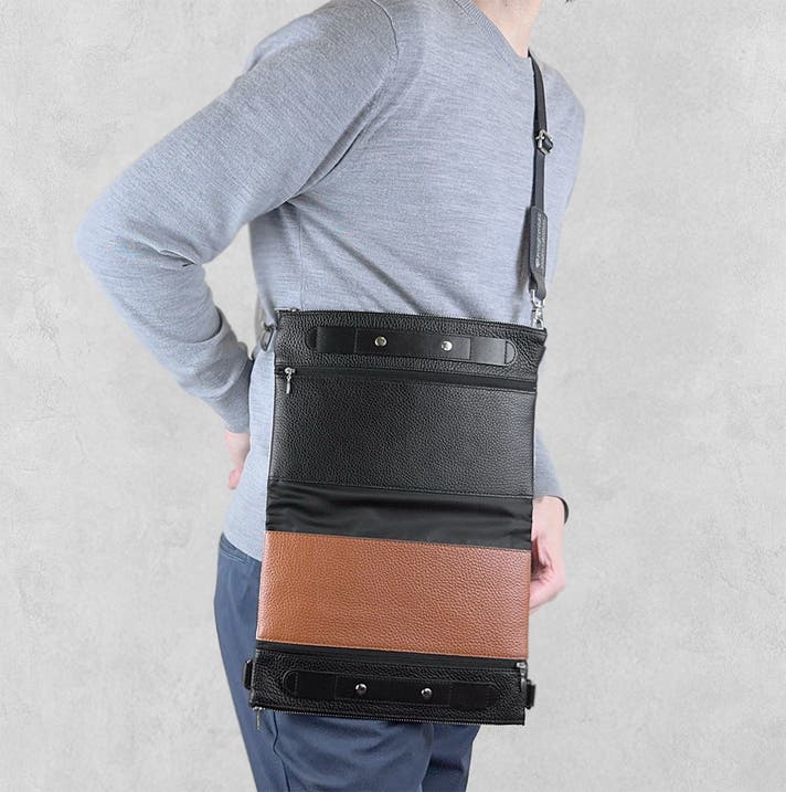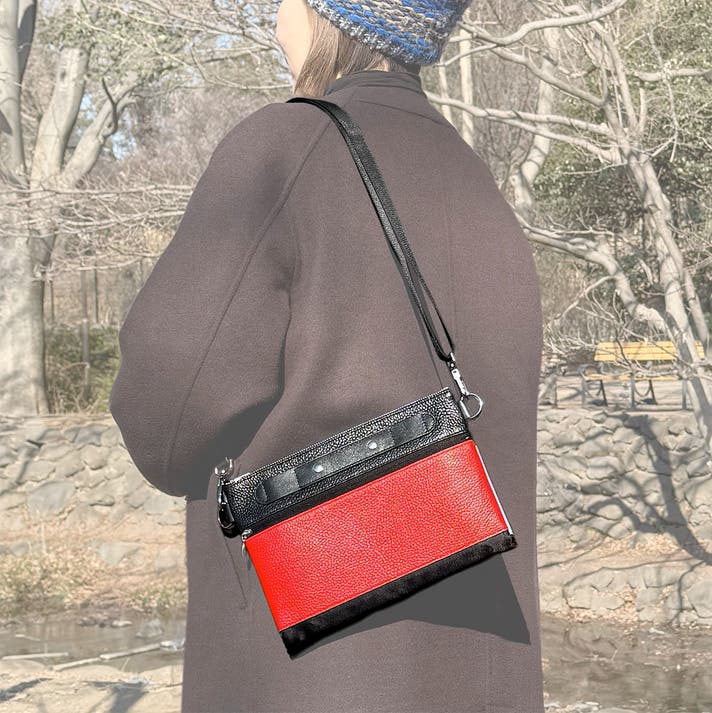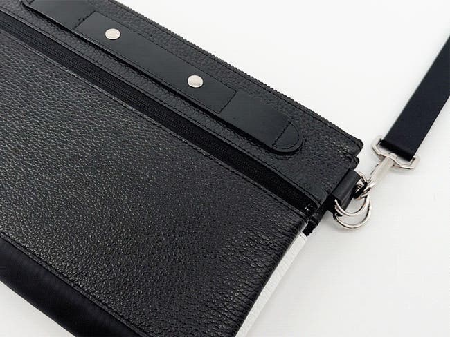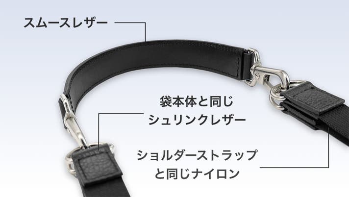 連結用ストラップは、袋本体と同じシュリンクレザーと、ショルダーストラップと同じナイロンを組み合わせて作られています。
