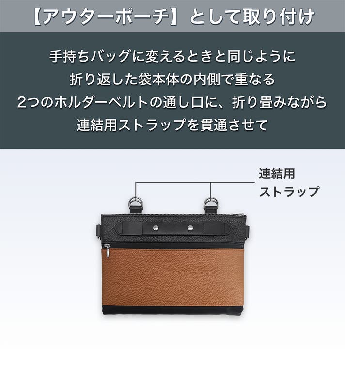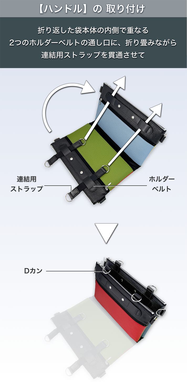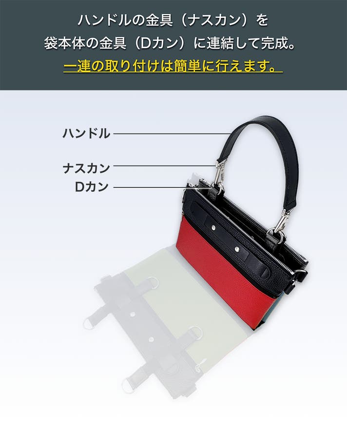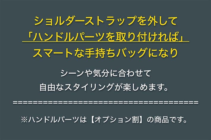 「手持ちバッグ」として使う場合のハンドルの取り付けには、ショルダーストラップを使った肩掛け時でも見た目がすっきりするよう