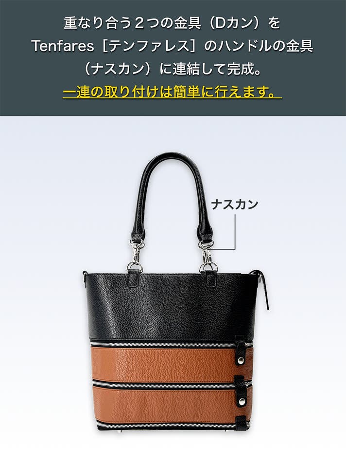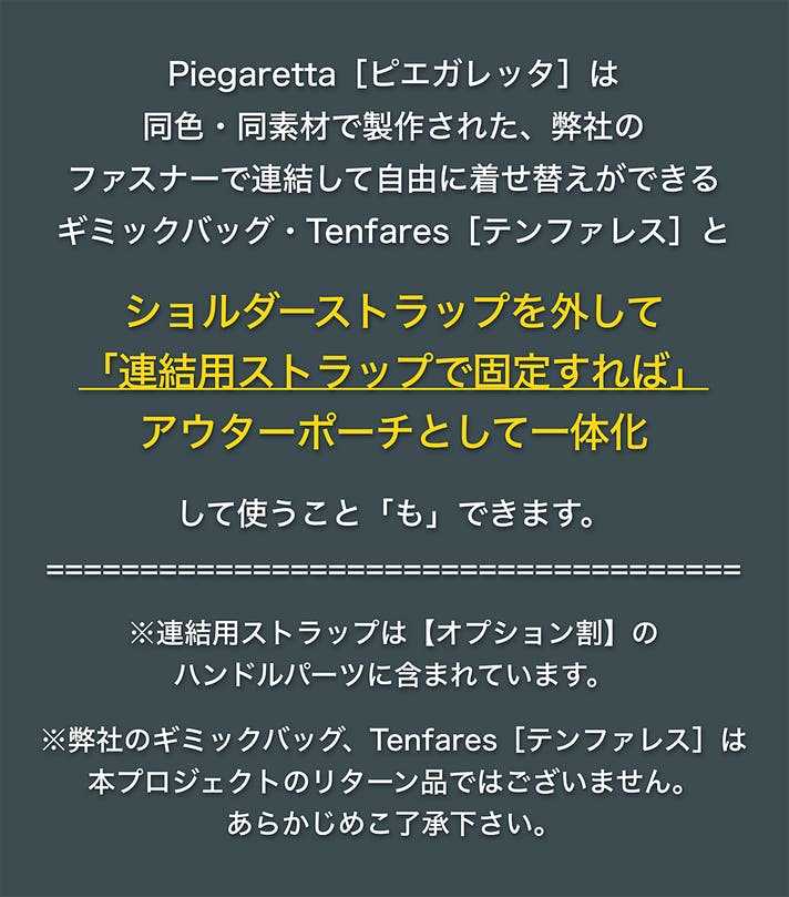 ギミックの項目でもご紹介した通り、Piegaretta[ピエガレッタ]は、弊社のファスナーで連結して自由に着せ替え可能なギミックバッグ、Tenfares[テンファレス]にアウターポーチとして連結すること「も」可能です。