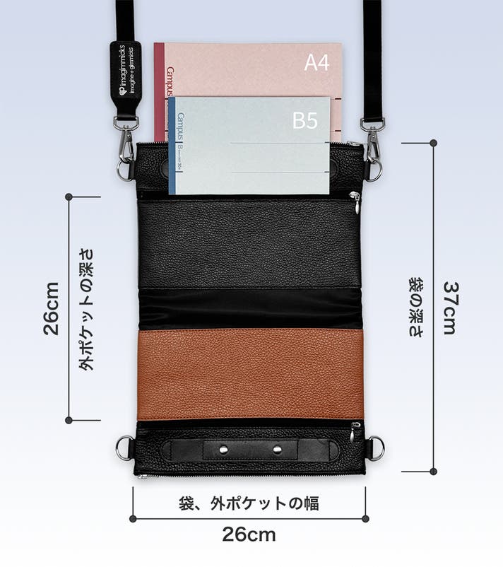 A2:スマートフォン、財布、鍵といった必需品はもちろん、iPad miniなどの小型タブレットも収納可能なサイズです。また、必要に応じて形を広げて使えるため、出先で予想外に荷物が増えた場合でも、A4サイズの書類などを折り曲げずに収納できる柔軟性があります。