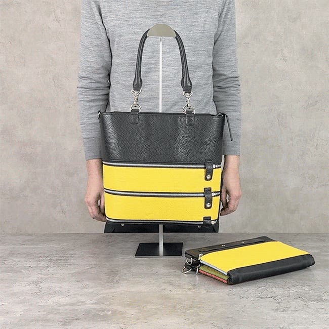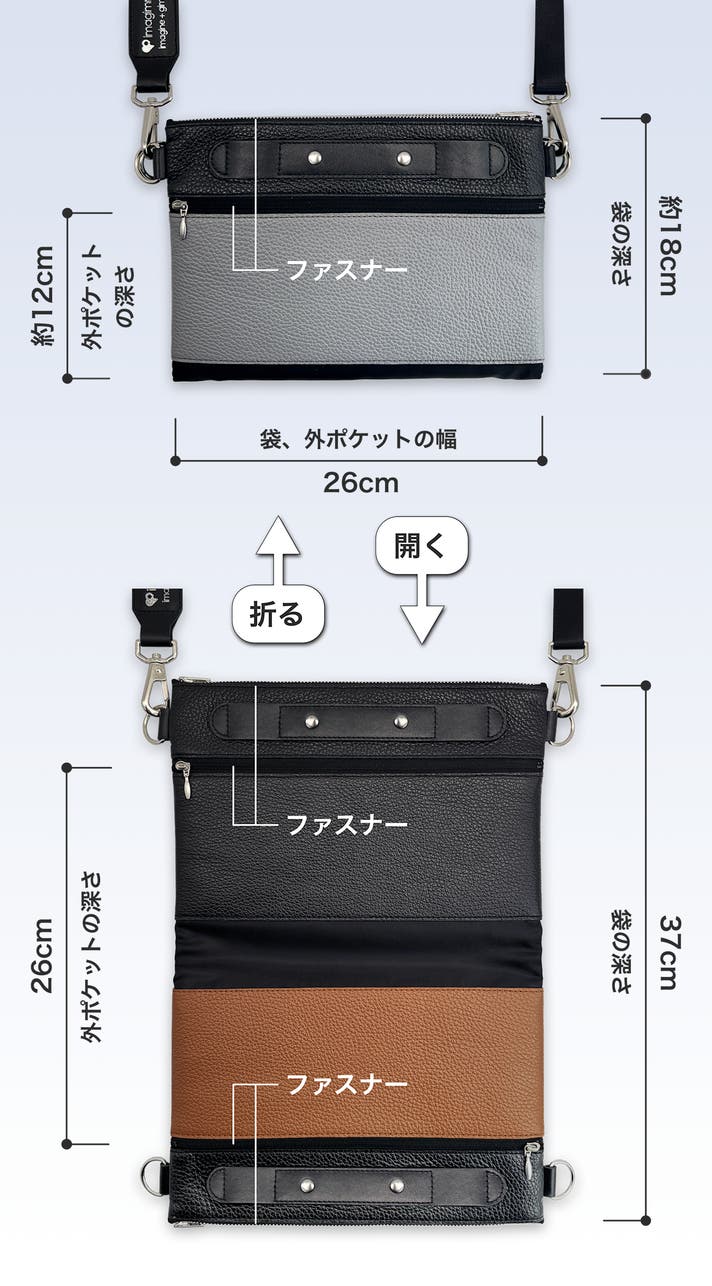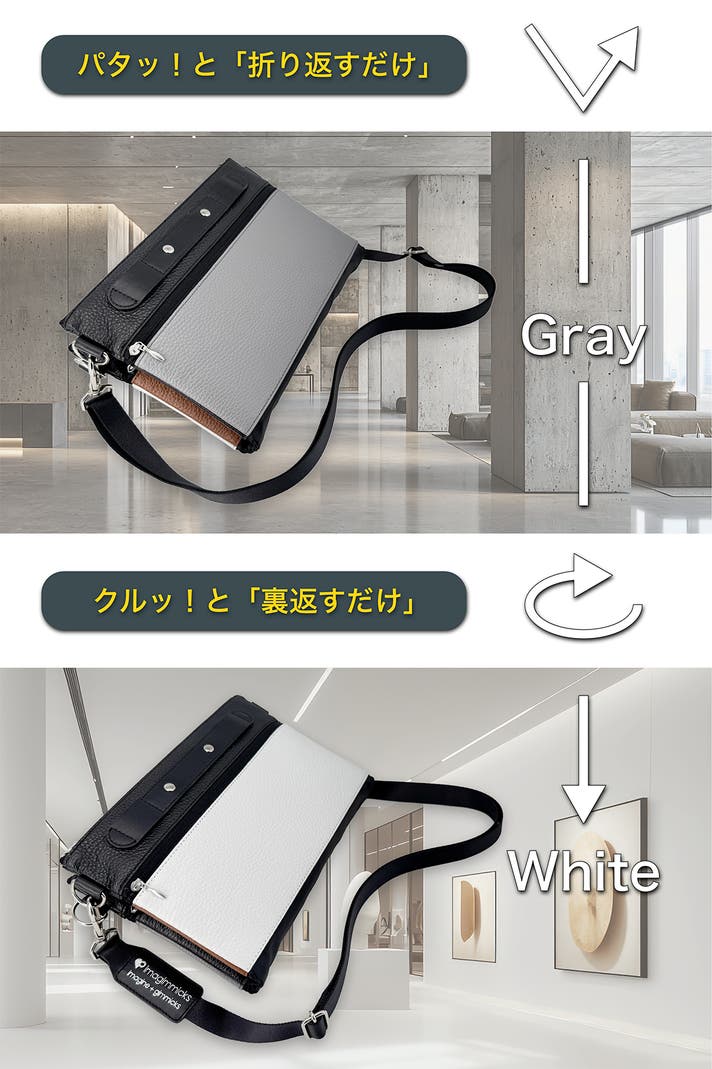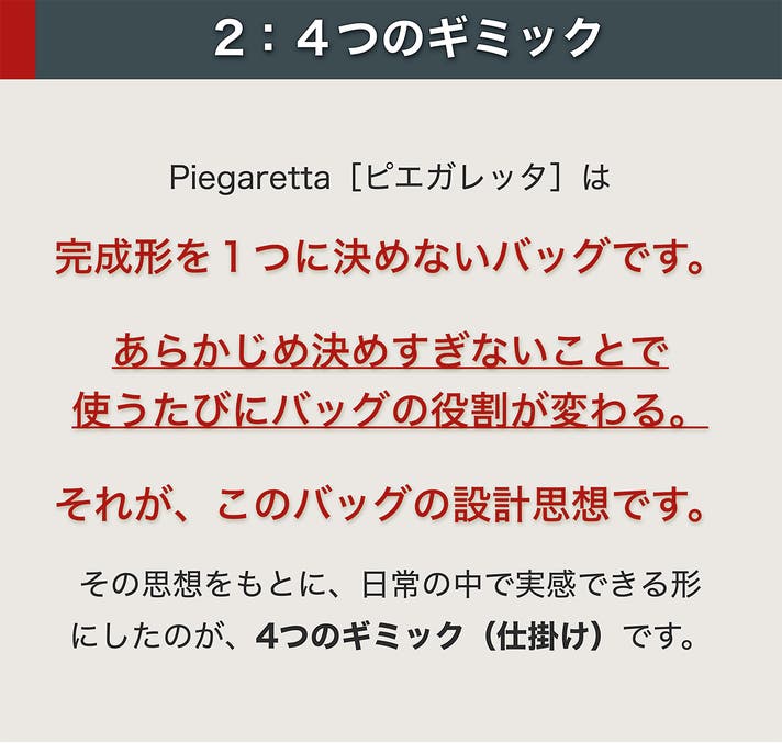 Piegaretta[ピエガレッタ]の「折り返すことで表情が変わるギミック」に基づき、バッグの在り方を再設計したデザインは、imagimmicks[イマジミックス®/イマジミックス株式会社]が独自に考案したものです。