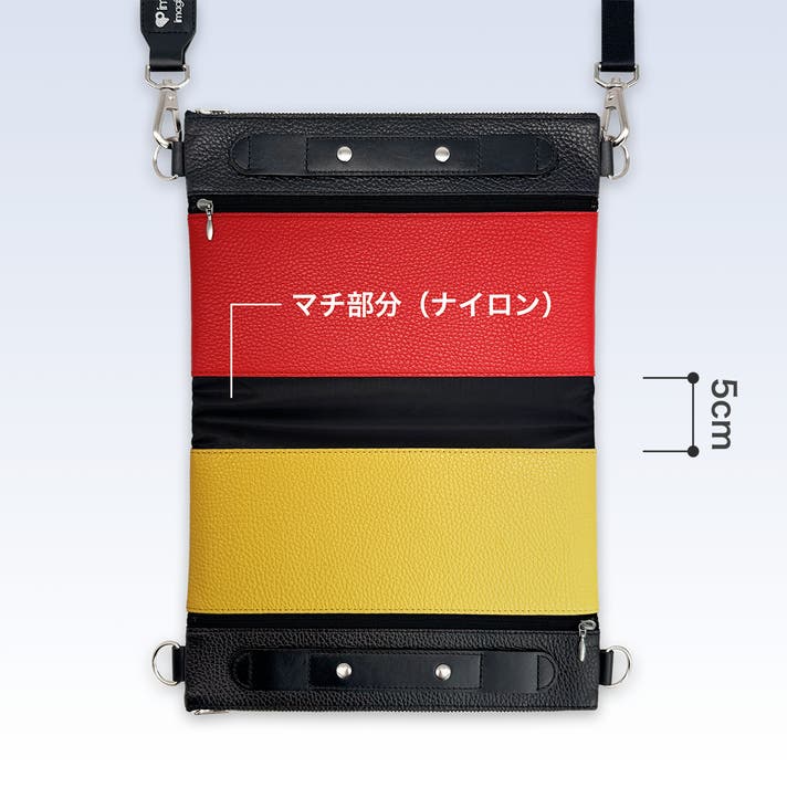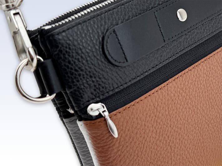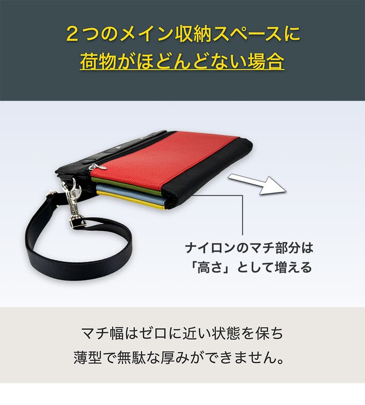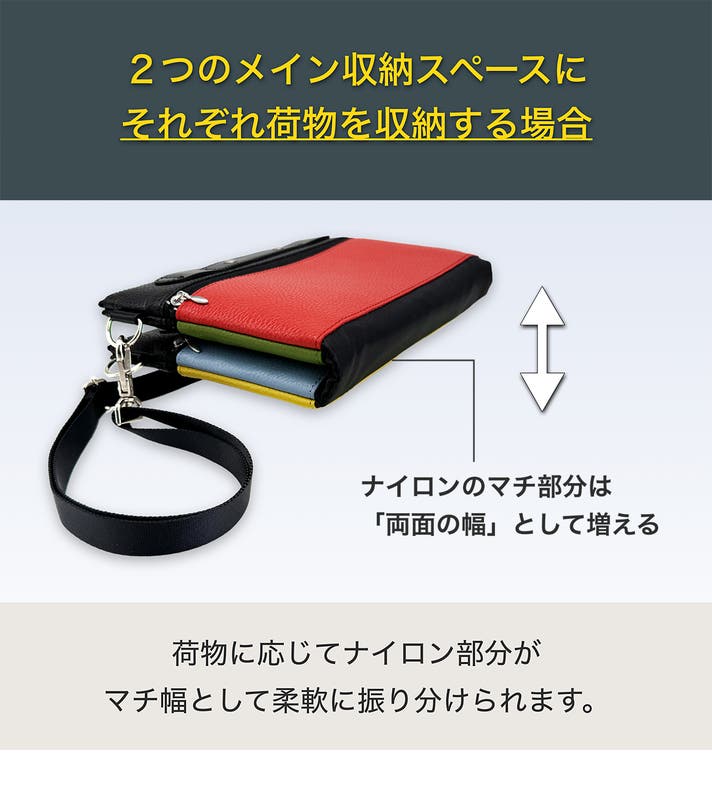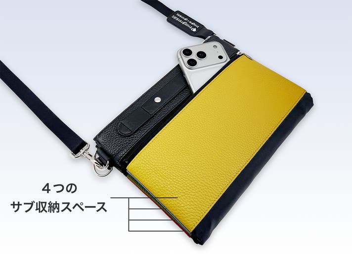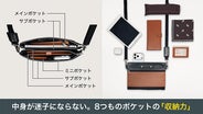 また、4色のレザー部分も全てファスナー付きのサブ収納スペースにしたことで