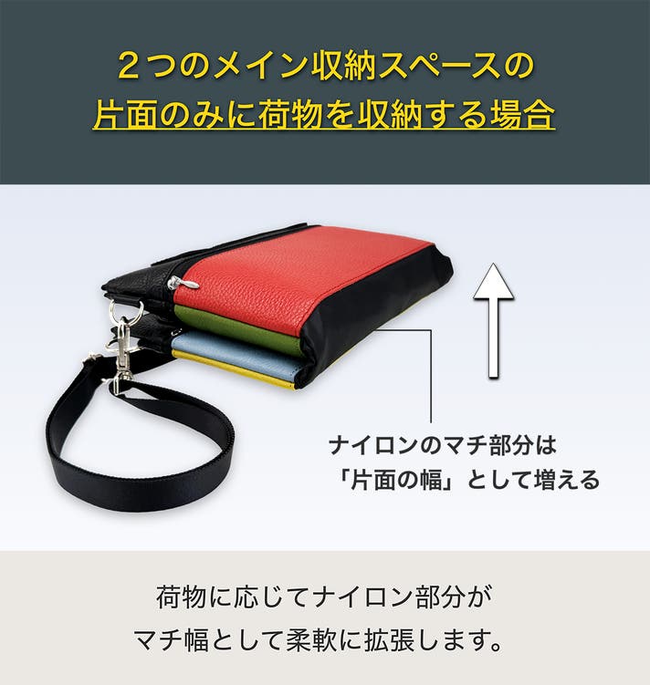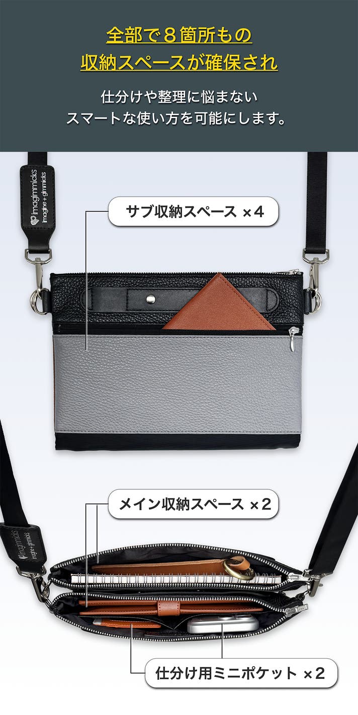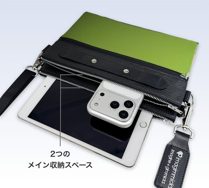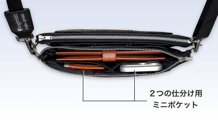 2室構造のため、スマホや財布、小型タブレットなど荷物の種類を明確に分けた収納ができます。