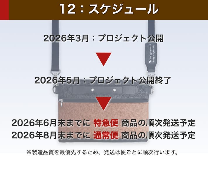 本プロジェクトは、ギミック構造を含む製品特性と、日本国内での丁寧な製造工程を大切にしているため、ご予約からお届けまで数ヶ月ほどお時間を頂戴しております。