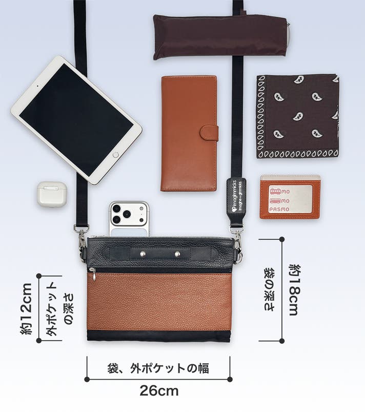 スマートフォンや長財布はもちろん、小型タブレット(iPad miniなど)や薄型の折りたたみ傘が収まる