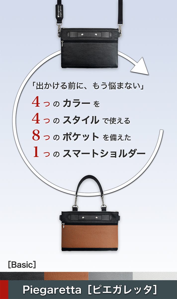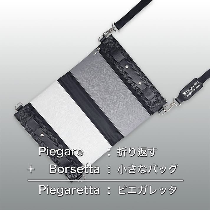 Piegaretta[ピエガレッタ]は、スマートなお出かけに求められる〈軽快さ・耐久性・デザイン性〉の最良のバランスを追求したバッグです。