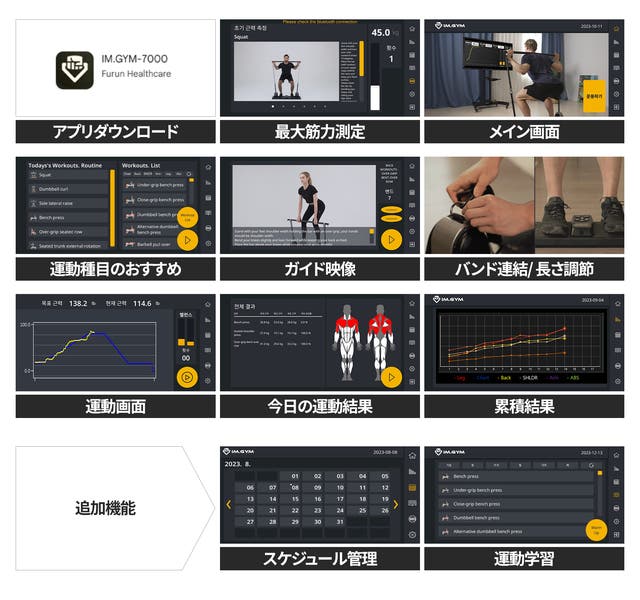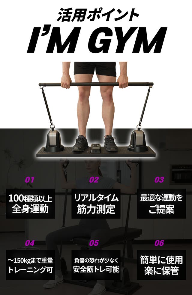 最近、自宅でできる筋肉トレーニングの需要が増えてきます。しかし、既存のホームトレーニング器具は運動を初めてする初心者とまともなウェイト運動が必要な熟練者両方に不便がありました。初心者の場合、どんな運動が自分に必要なのか、適切な運動強度と時間、運動方法などが分からなくて体系的で効率的な運動をすることが大変で、熟練者には重量範囲が小さくて満足できる筋力運動をすることが難しかったです。このような不便さを解消するために当社は一つの製品で100種類以上の運動が可能で、運動部位の筋力を150kgまで0.1kg単位で細かく測定できる運動力学及び筋力感知技術と使用者の運動能力に合うレジスタンスバンドをおすすめするなど利便性の高い技術、測定された筋力データを基にオーダーメード型運動ルーティンを提供する管理技術などが搭載されているIM.GYMを開発し、初心者から熟練者まで皆が簡単でスマートに運動することができます。