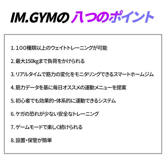 多くの製品は20~40kgぐらいの低い重量の運動が可能ですが、IM.GYMは0~150kgまで充分な負荷をかけてしっかりとした本物のウェイトトレーニングができます。