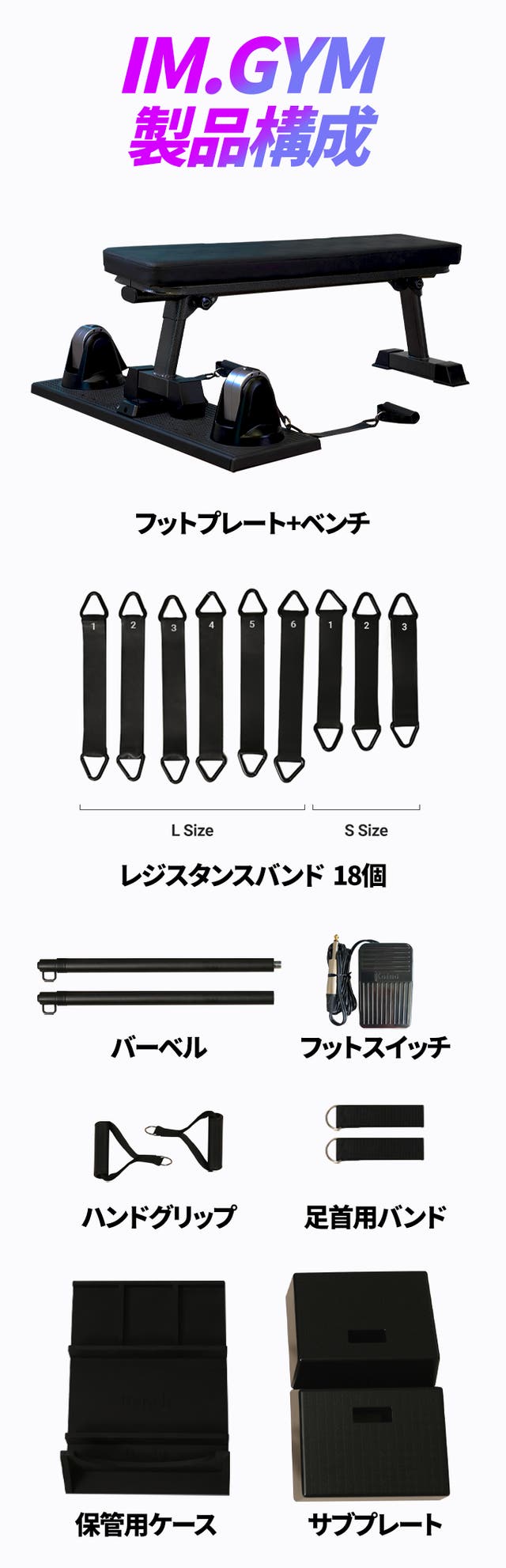 様々なトレーニングを行うには、ジムのように運動器具を揃っておくべきしょうか。その必要ありません! IM.GYMがあれば、100種類の筋力運動を体系的に行うことができます!一つの運動器具で皆さんの下半身、胸、背中、肩、腕、腹部など全身を均等に鍛えてみてください。