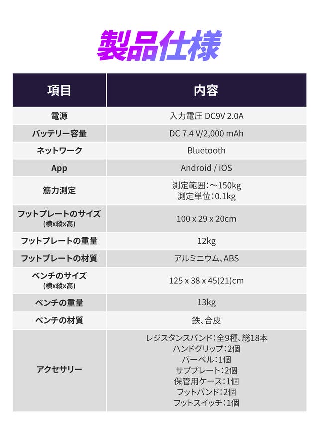 - 製品一つで100種類の全身運動を150kgまで十分な負荷を上げてトレーニング可能
