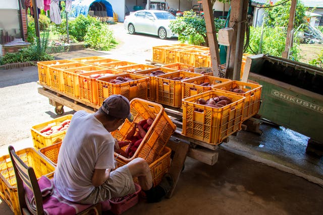 倉庫の中で厳重に温度管理されて熟成した芋は、一つ一つ手作業で丁寧に下処理されていきます。