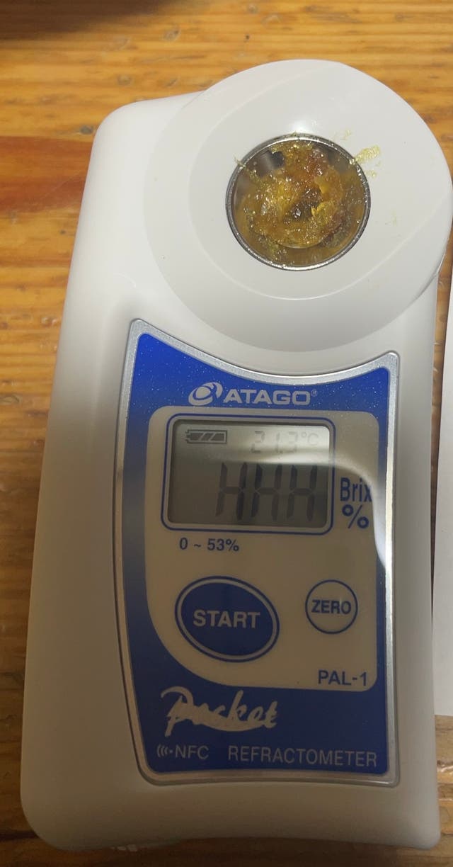 53℃まで計測できる糖度計で、53℃超えの数値が出ています。(53%以上のためHHHという表示になっています。上の21.3℃の表示は気温です。)