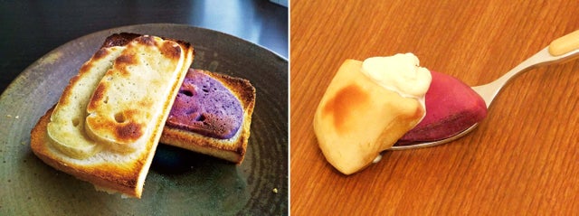 いももちトースト:半分にスライスした餅をパンに乗せ、お好みの焼き加減に焼きます。